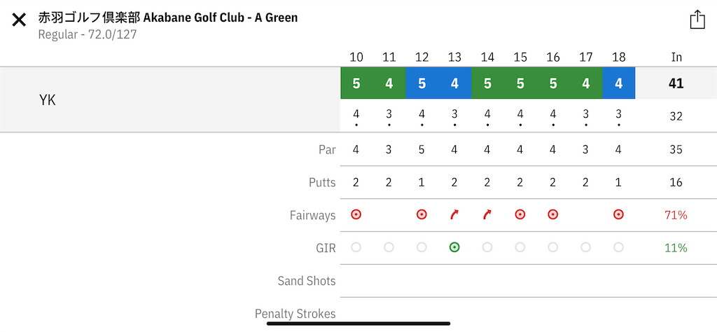 - 10番パー4。ドライバーが超トップしたけどまっすぐ飛んだ。4iでグリーンを狙ったけど届かず。ボギー。